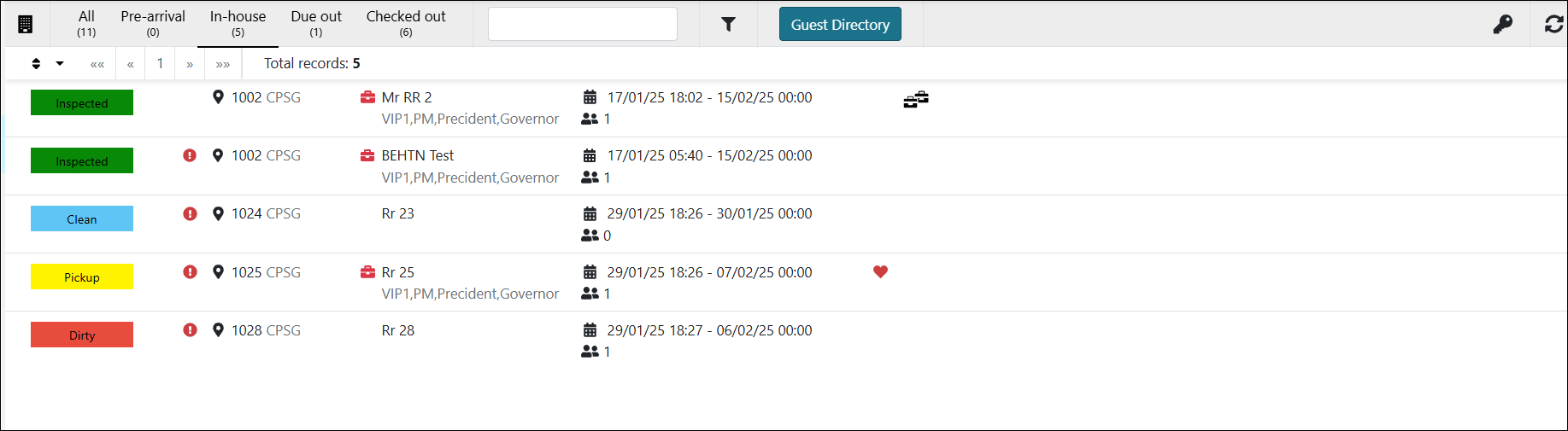 The GUESTS screen provides a summary of all registered guest details for your property, allowing you to view guest information at any status. You can apply filters and use the guest directory to search for guest details across the entire database.