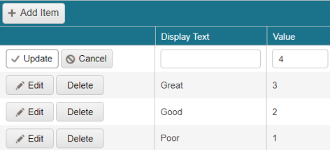 When you select Range of Values for the Checklist Type, the List table appears. Use this table to enter the text that the inspector selects to score checklist items.