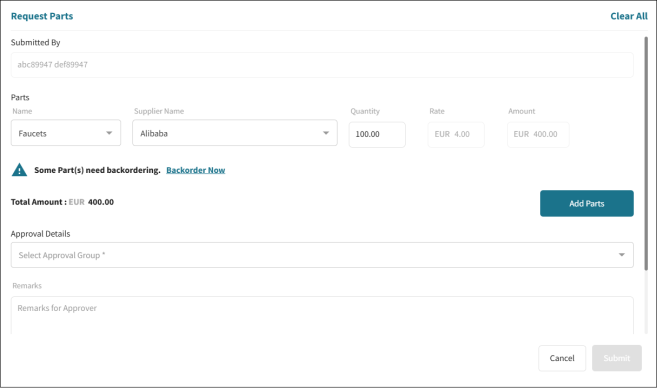 Use the request parts dialog box to streamlines the workflow of part requests, ensuring clarity, accuracy, and efficient tracking of work orders.