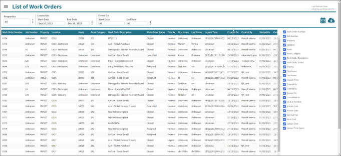 List of Work Orders—This view displays a table of work order data for your selected properties. Use the pane at the right side of the screen to select the columns that appear in the table.