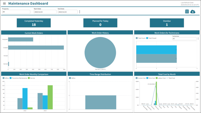 Work Orders—The default view of the screen displays charts with work order information for your selected properties.