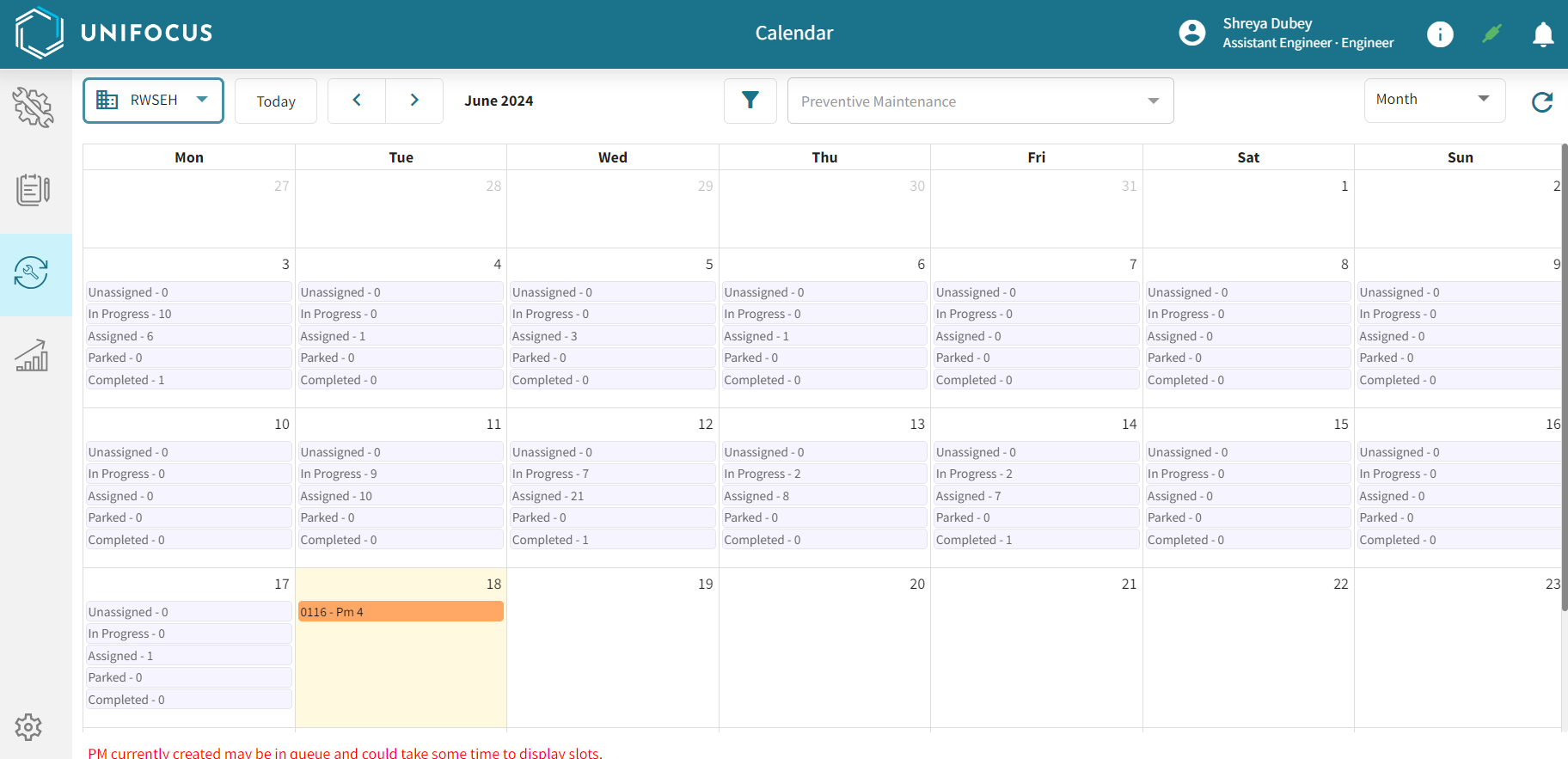 The Calendar screen in the Preventive Maintenance component of the Maintenance software displays a calendar view of your preventive maintenance tasks.