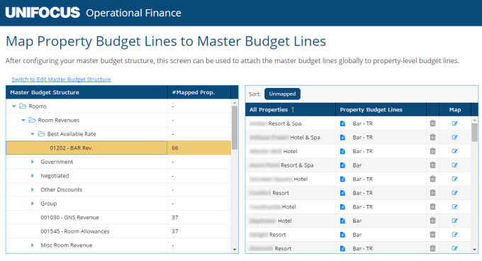 A master budget structure is needed to allow for roll-up reporting outside of a single property. Most companies have a similar chart of accounts (COA) in which an account number is used to record revenues, costs, and units for a specific reason. However, each individual property describes the COA differently. For example, in a Food & Beverage Department of a hotel chain, all full-service properties have at least one restaurant. A company does not create a single COA entry for each restaurant at all of their properties—doing so would result in a massive and untenable COA. The company usually creates multiple cost centers. Because each property in the company's portfolio might have a differently named restaurant, budget administrators customize the company's COA to their needs. This process includes customizing the names for restaurants in their COA and budget tree.