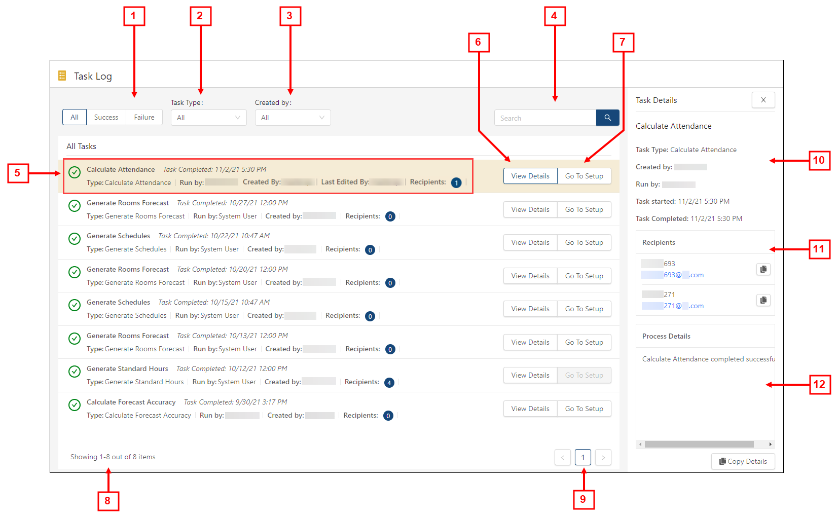 | 8 | Showing ___ out of ___ items | Text that describes the number of displayed tasks out of the total number of created tasks. | Read-only. |