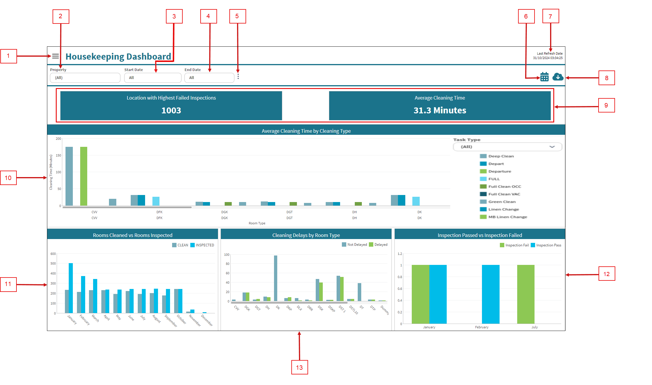 This read-only text displays the date and time (in the UTC time zone) when data was last refreshed. The data in the Housekeeping Dashboard is updated every 5 hours, starting at 00:20 (12:20 AM) UTC, and might not match data in existing reports or in the Housekeeping software, depending on when you last made changes in the software. |