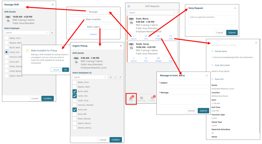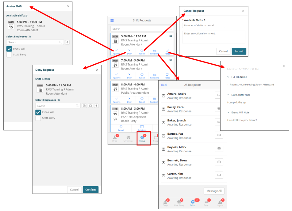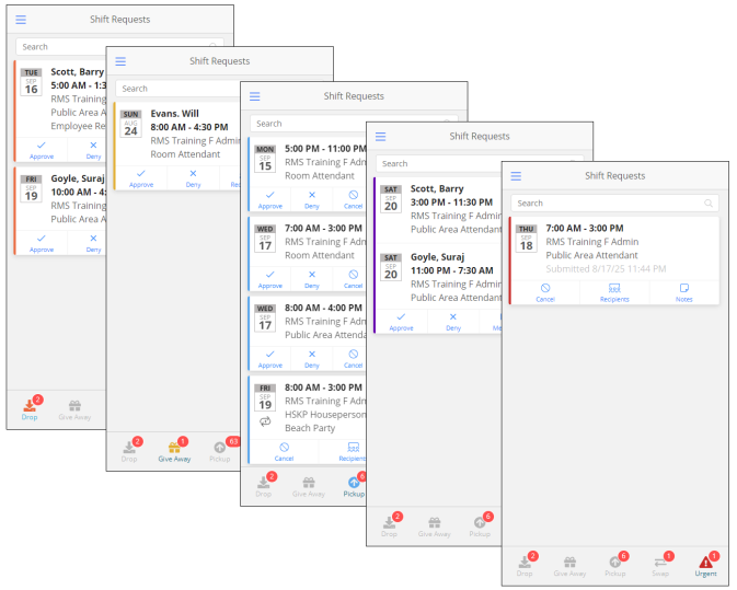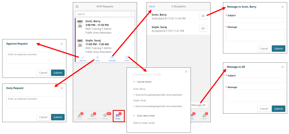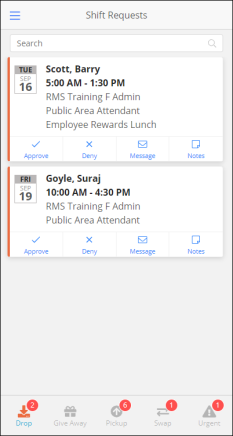 The Approve Shift Requests screen allows managers to review and take action on various types of employee shift requests, including drop, give away, pickup, swap, and urgent requests. From this screen, managers can approve or deny requests, view request recipients, cancel pickup or urgent shifts, and send urgent pickup requests to eligible employees. Grouped shift functionality streamlines actions on identical requests, enabling managers to respond to or cancel multiple requests at once. Additional features include access to shift notes and in-app messaging, making it easy to manage scheduling communication directly within the Mobile App.