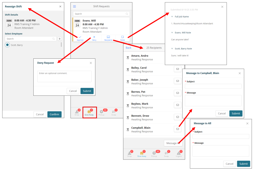 Viewing all recipients of a give away shift and messaging them individually or as a group enables targeted communication, helping you fill shifts more efficiently and reduce scheduling delays.