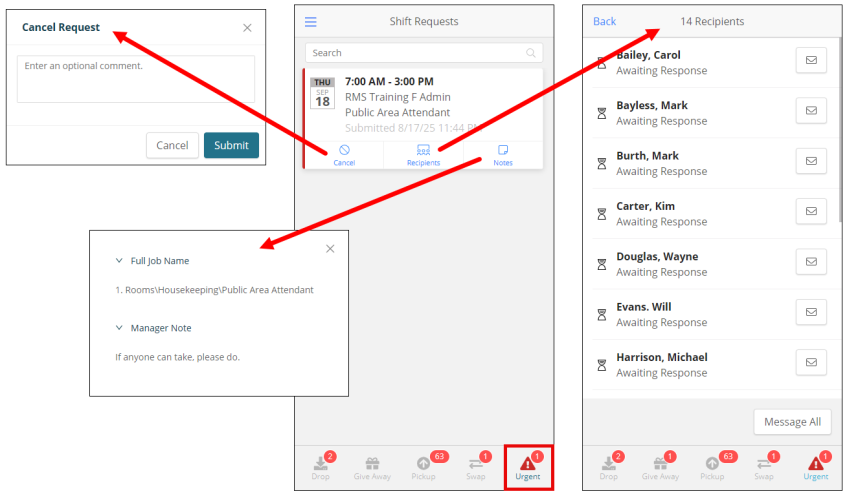 Viewing all recipients of a request and messaging them individually or as a group enables targeted communication, helping you fill shifts more efficiently and reduce scheduling delays.